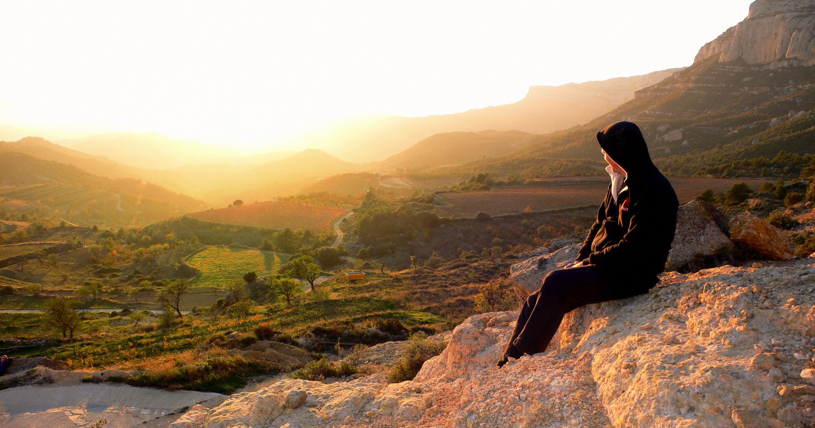 A photo of a woman sat overlooking a beautiful view in South African vineyards and mountains as the sun sets